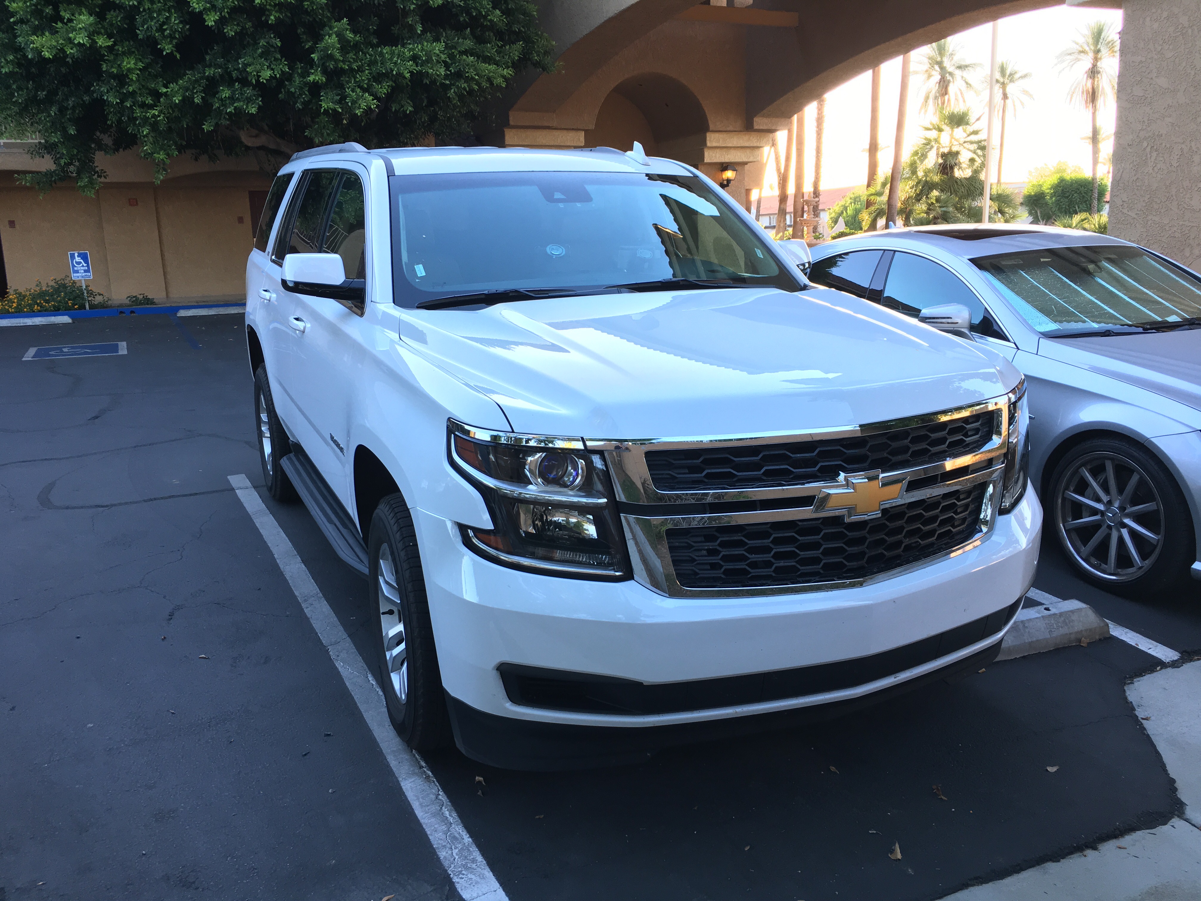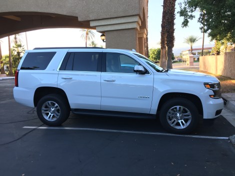 Zatím to ale jde a tak v půjčovně National jsme za minutku na řadě, za dalších 5 minut podepíšu smlouvu a tradá na parkoviště pro auto. Tam už se na nás z dálky směje Chevy Tahoe, který byl jeden z mnou pŕedem vytipovaných modelů (víc jsem původně chtěl Suburban, ale Tahoe taky dobrý). Rozhodnout pomohla tentokrát i barva. Určitě jsme do těch veder (v příštích dnech má být i 47 st.) nechtěli tmavé auto. Náš Tahoe je bílý, takže OK.