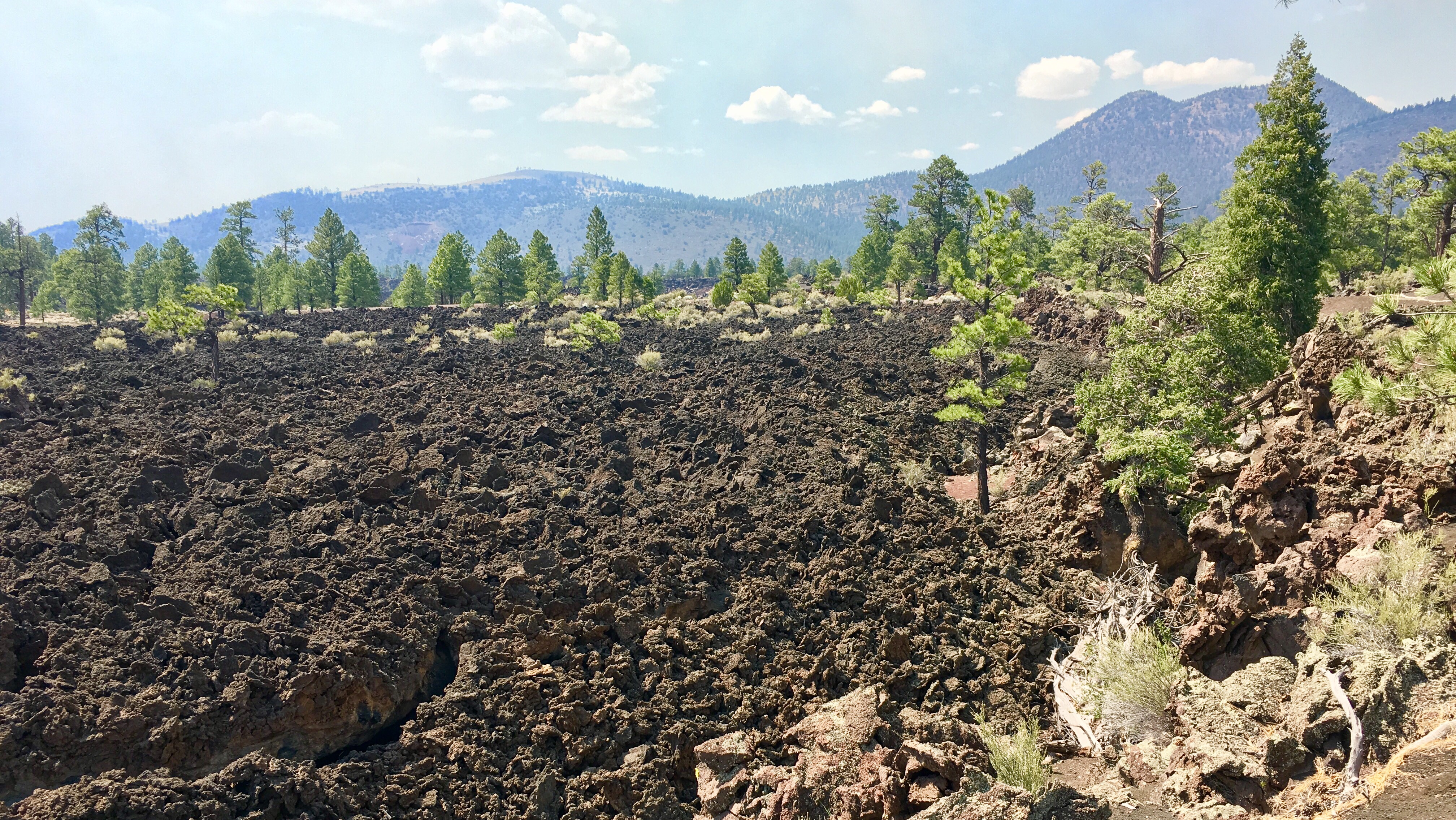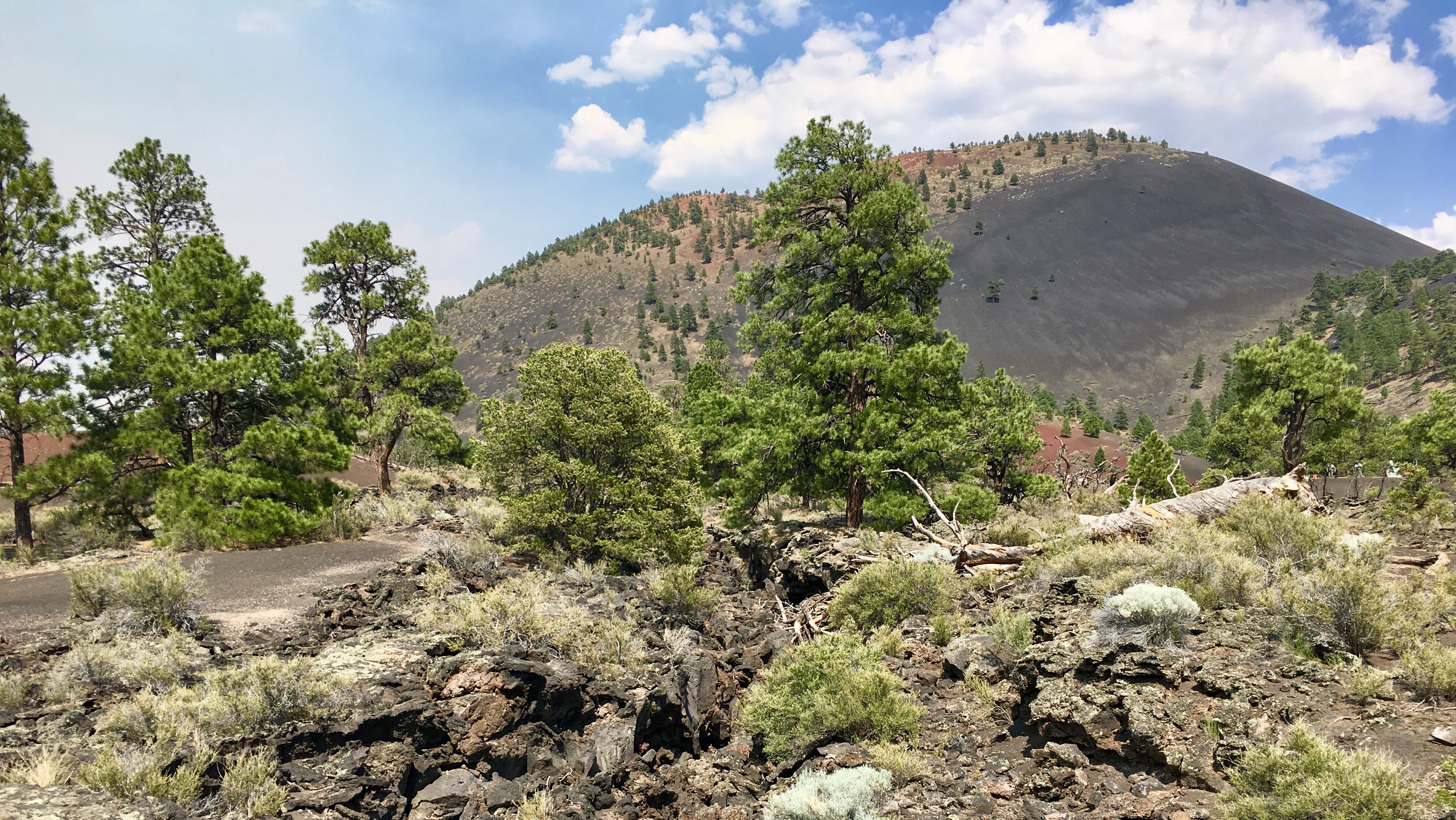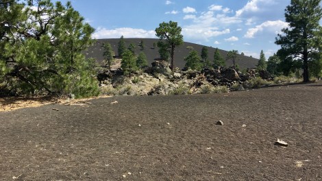 Sunset Crater Volcano National Monument. Poslední erupce sopky proběhla v letech 1300, ale okolí sopky vypadá, jako by to bylo včera. Maximálně předevčírem. Celý kopec (2451m) je pokrytý černou struskou, kde vůbec nic neroste, ztuhlé lávové proudy vysoké až několik metrů na rozloze 5 km2. Prošli jsme si část Lava Flow Trail.