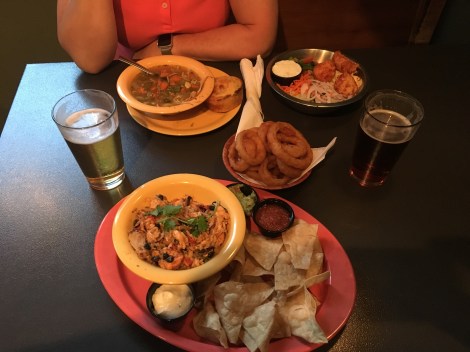 Lumberyard Brewing Co. Vzhledem k tomu, že přes den jídlu moc nedáme (jedeme jako každý rok na Original Beef Jerky, oplatky, sýry, ovoce a pochopitelně spousta vody) večer to pak doženeme něčím dobrým. Po večeři (už za tmy) procházka historickým centrem Flagstaff, kde to začíná žít.