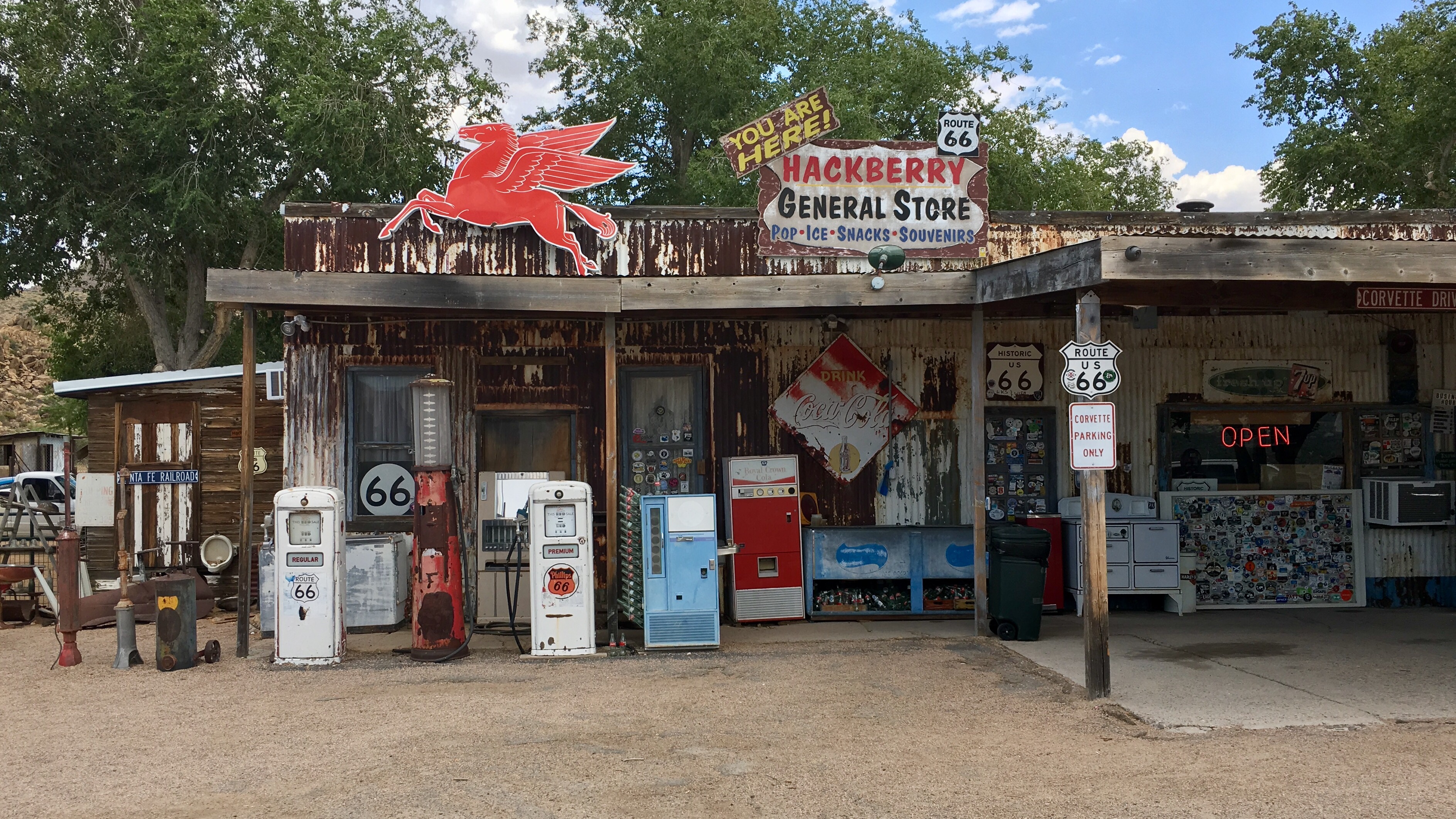 Pak už najíždíme na Route 66 a zastavujeme na mnoha místech, kterými je tahle “Mother Road” poseta. Seligman, Peach Springs, Hackberry, Kingman, Cool Springs, Oatman. Každé místo je něčím zvláštní a dalo by o nich dlouho povídat, což je spíše na dlouhé zimní večery. Takže alepoň pár fotek.