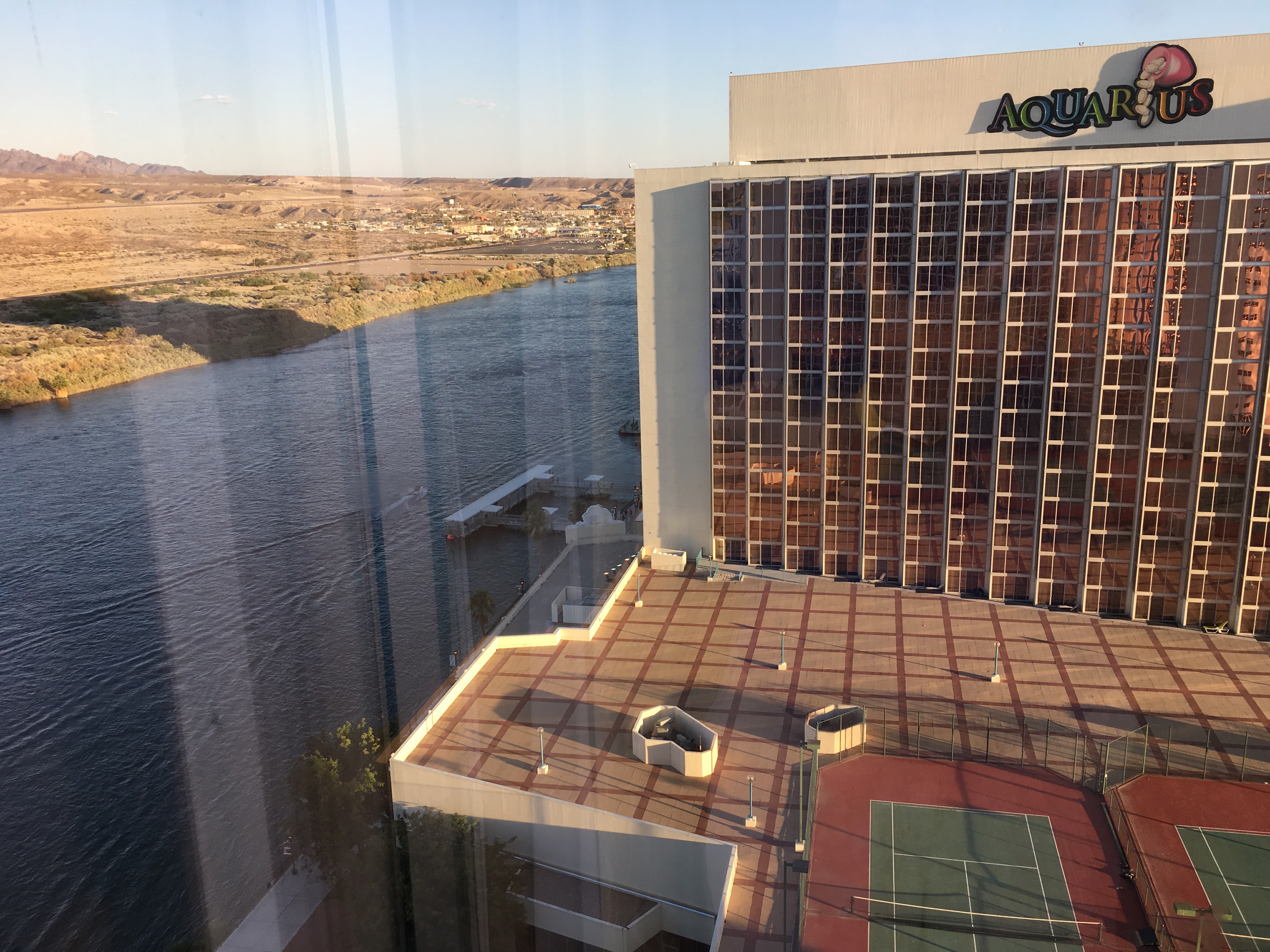 Náš hotel Aquarius Casino Resort je poněkud jiného ražení, než motely na cestách, které obvykle používáme. Bydlíme v 18tém patře, v pokoji číslo 18056 s nádherným výhledem na řeku Colorado. Je to taková malá aklimatizace na Las Vegas, kam míříme zítra.