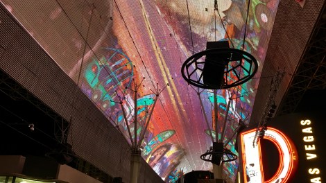 Pak se (kolem šesté odpoledne) vracíme na skok do našeho hotelu a a jdeme na další skvělou bufetovou večeři, tentokrát u nás, v hotelu Aria. Pak už vyrážíme znovu do víru velkoměsta a jdeme se podívat na další dvě atrakce, které jsme minule nestihli: Fremont Street a Stratosphere Tover. Obojí se popisuje velmi těžko a musí se to vidět. Fremont Street je druhá (po Stripu) nejznámějśí ulice v Las Vegas (a na rozdíl od Stripu opravdu leží v Las Vegas). Asi 500 metrů je zastřešeno a strop je osazen 12ti miliony žárovek. Otevřeno je tu 24 hodin, ale nejvíc to tu žije pochopitelně po setmění. Spousta lidí, spousta hudby, spousta zábavy.