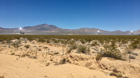 První malá odbočka z trasy je u Ivanpah Solar Power Facility. Jde o velice zajímavý projekt, největší svého druhu na světě. Je to solární elektrárna, ale trošku jiná, než jsme zvyklí. Elektrárnu tvoří tři věže obklopené 173 500 stojany se dvěma zrcadly, heliostaty. Zrcadla směřují sluneční energii do plochy absorbéru, umístěného vysoko na věži, v nichž se skrývají nádrže s vodou. Vzniklá pára pohání turbíny s výkonem 390 MW.