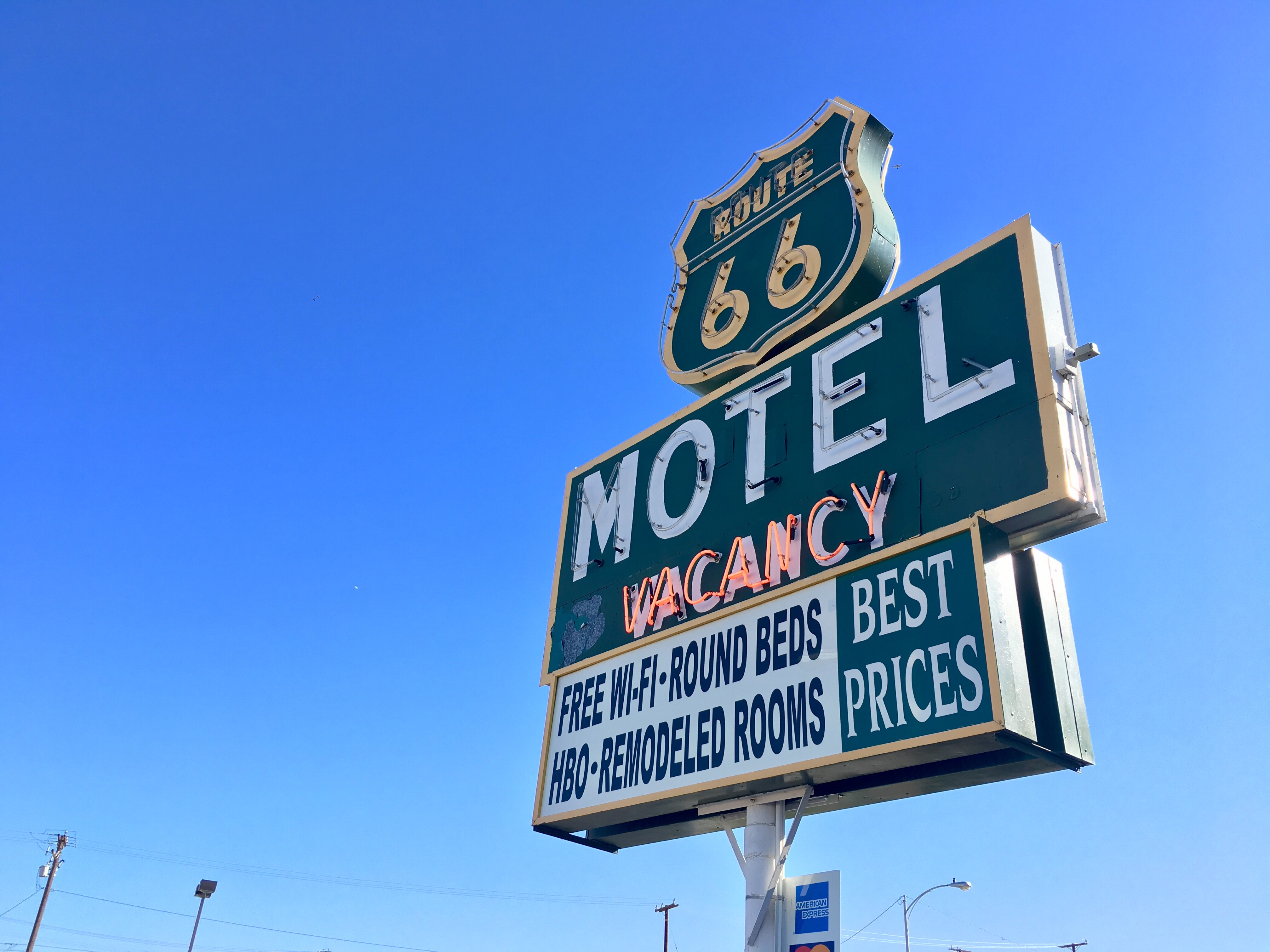 Projdeme, pokoukáme, pofotíme a pak jedeme do nedalekého Barstow, kde máme nocleh. Protože všechna ubytování na trase jsem rezervoval předem, víme pochopitelně, do čeho jdeme. Zatím, co v Las Vegas jsme si chtěli užít luxusu bydlení na Stripu, tady je to zase trošku o tradici. Bydlíme ve starém, World Famous Route 66 Motel. Originální motel, založený 1922. Dýchne tu na nás nostalgie z cestování před 100 lety. Pravda, trošku kulturní šok (po ubytování v LV), ale to je právě ono. Mimo jiné, tak čistý pokoj byl snad jen v Arii a USA TODAY nominoval motel na jeden z „10 great places to stop along the way Route 66„