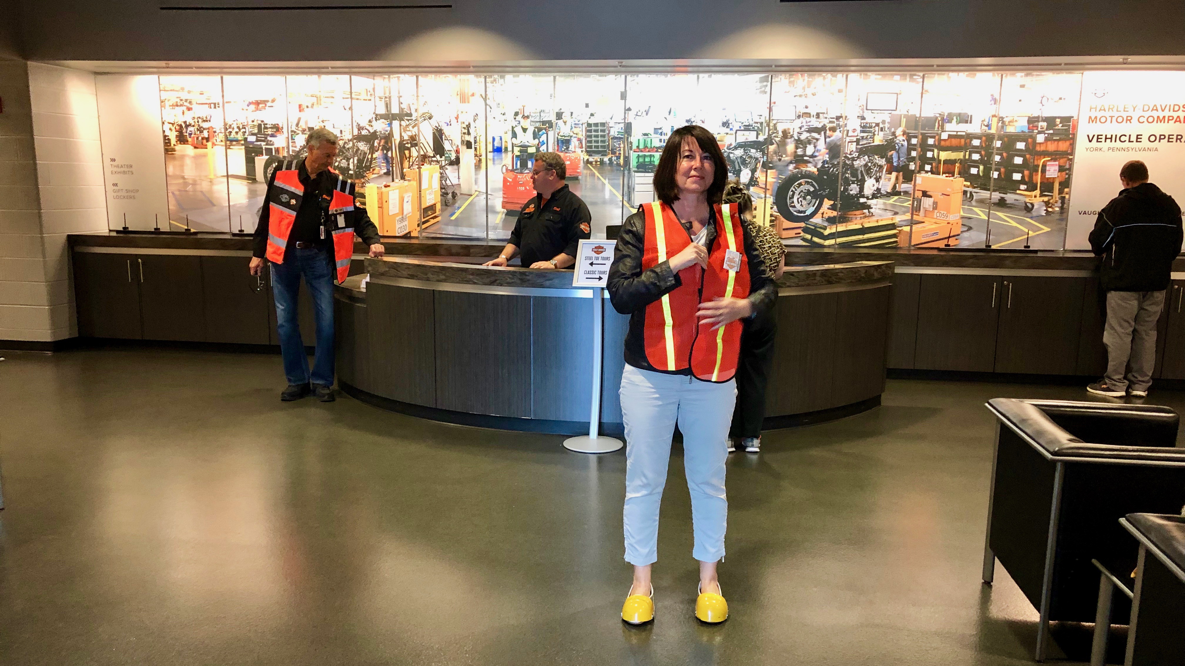První zastávka, po cca 2 hodinách jízdy, je ve městě York, PA. Tady máme, v továrně Harley-Davidson, rezervovanou prohlídku, nazvanou Steel Toe Tour. Nejprve nafasujeme oranžové výstražné vesty a na boty dostaneme návleky jako v nemocnici, akorát že s ocelovou ochranou špičkou – odtud název Tour. Prohlídka trvá 2 hodiny a průvodce nás protáhne celou výrobou: od kusu plechu, ze kterého se lisují jednotlivé části motorek, až po expedici hotových strojů. V naší skupině nás bylo pět: my dva, americký pár z Pensylvánie a průvodce. Ten se nám intenzivně věnoval a všechno komentoval do mikroportu. My jsme měli na uchu sluchátko, kam se jeho hlas přenášel, takže jsme ho i v hluku výroby dobře slyšeli. Popis jednotlivých fází výroby by byl na dlouhé vyprávění, ale rozhodně stál za podívání.