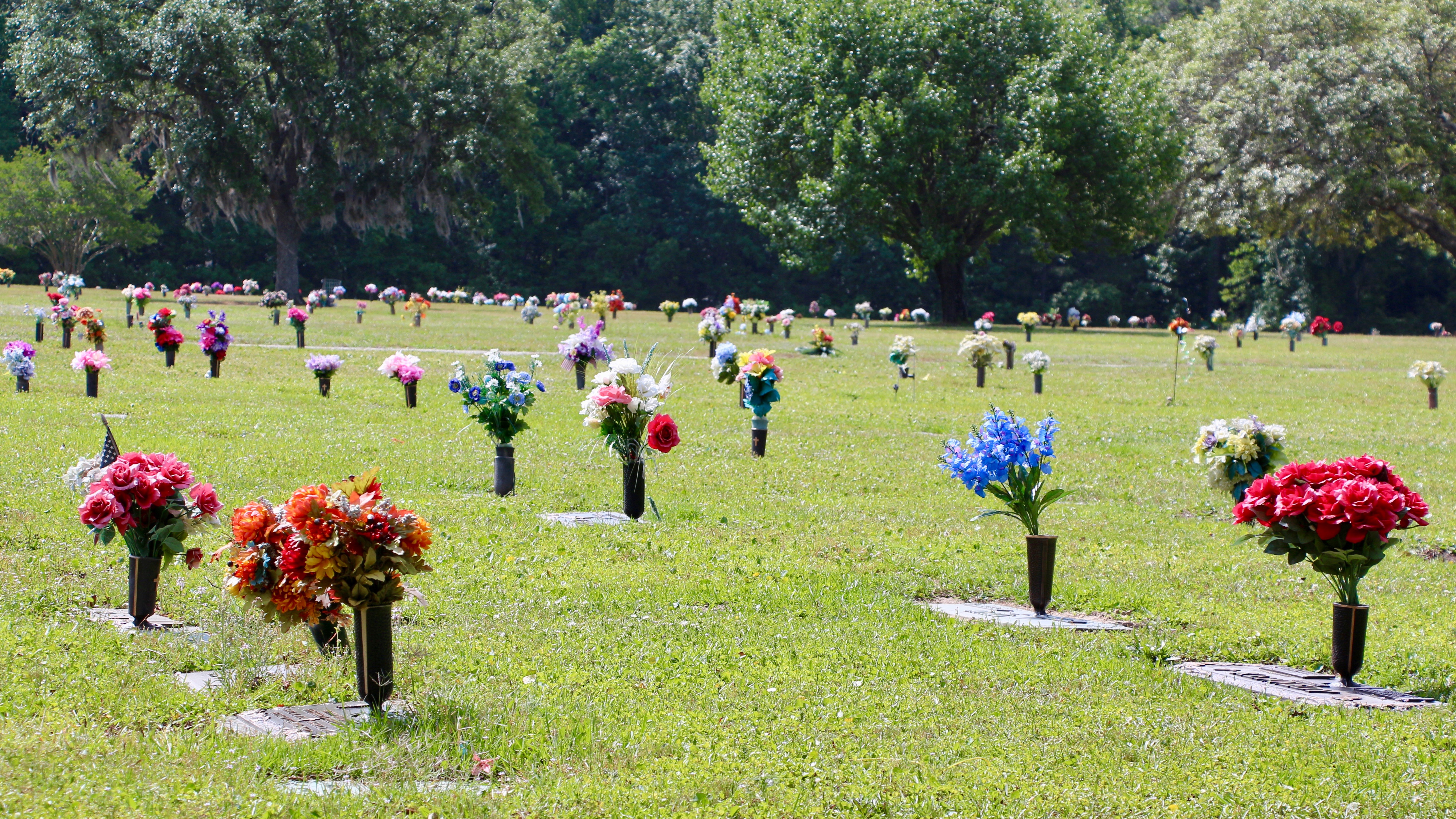 Po zahradách už jedeme směr Hilton Head Island. Cestou malá, neplánovaná zastávka na místním hřbitově. Je, jako asi většina tady „Drive Thru“, takže nemusíme ani vystupovat. A mimochodem, ty kytky jsou všechny umělé. Taky jsme viděli místo připravené na pohřeb, ale to bylo na delší povídání.