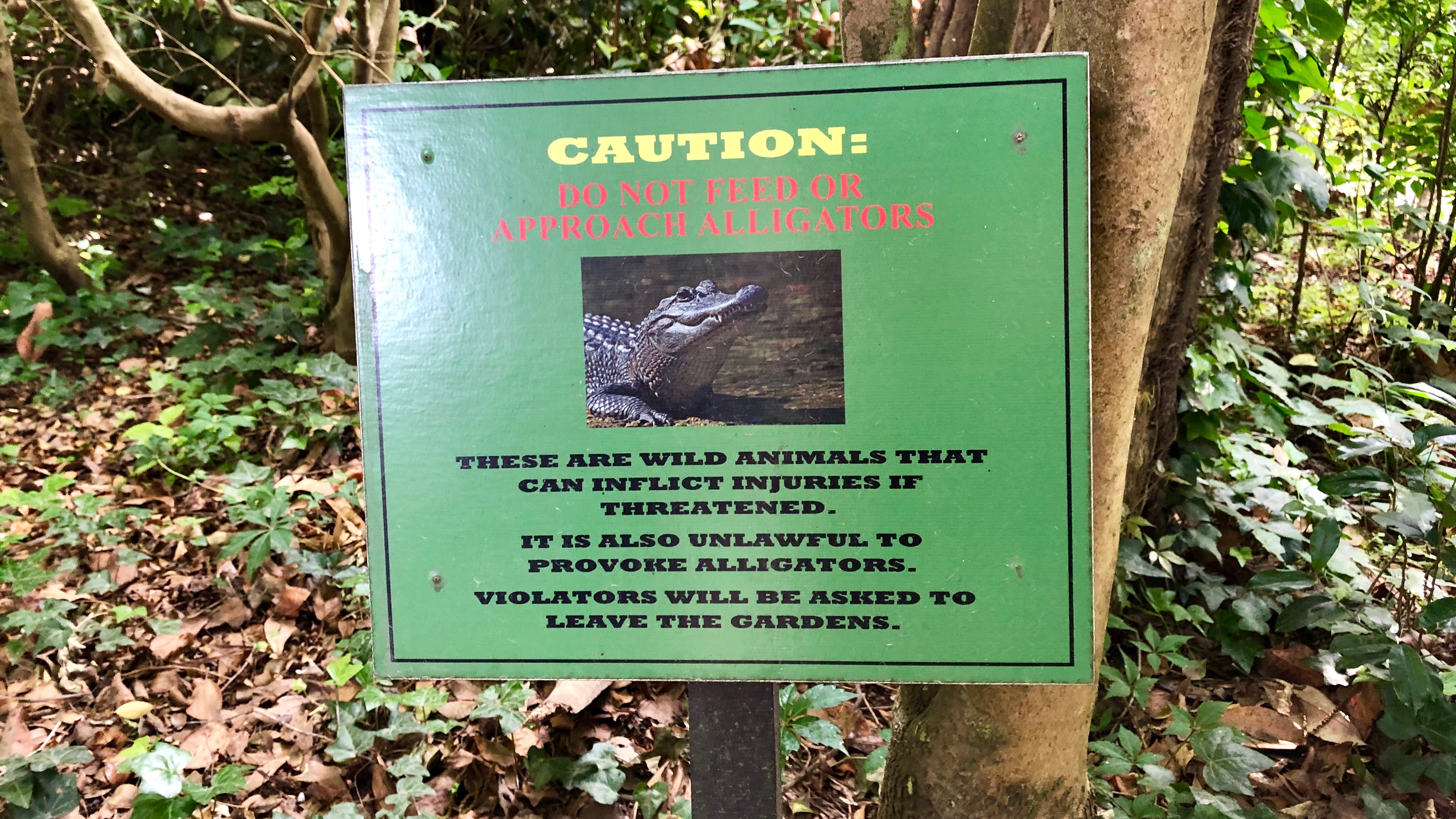 Hned na začátku nás upozorňují, že tu v zahradě rozhodně nejsme sami. Je to přesně ten typ cedule, který Dana nechce vidět, ale co už.Procházíme celou zahradou a Dana opatrně našlapuje a neustále se rozhlíží. Nevěřil jsem, že bychom nějakého aligátora viděli, ale nakonec se na nás usmálo štěstí. Byl to sice jen malý jedinec, ale jak jsme říkali na Maledivách: když jsou tu malí žaloci, budou tu i velcí.