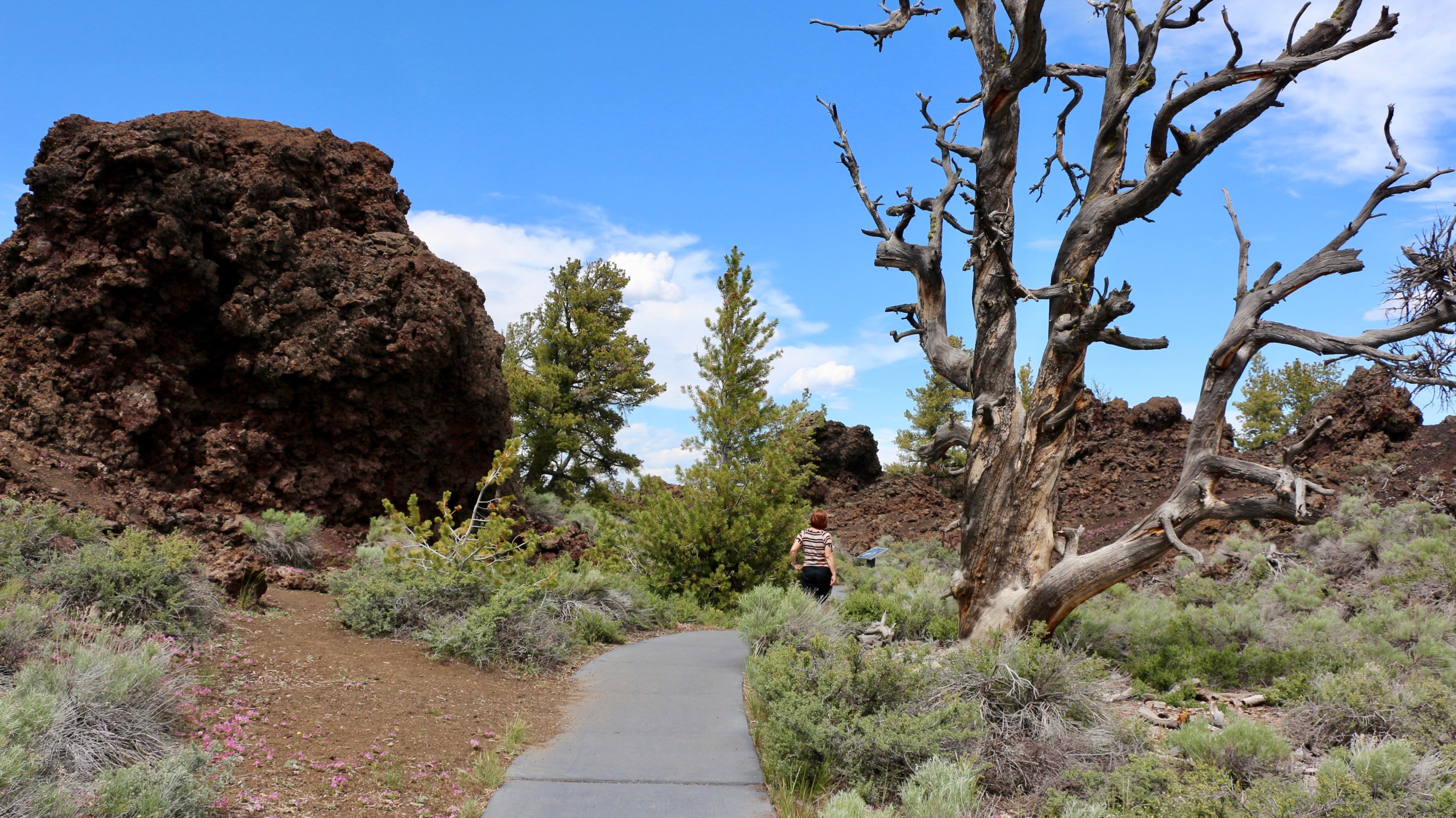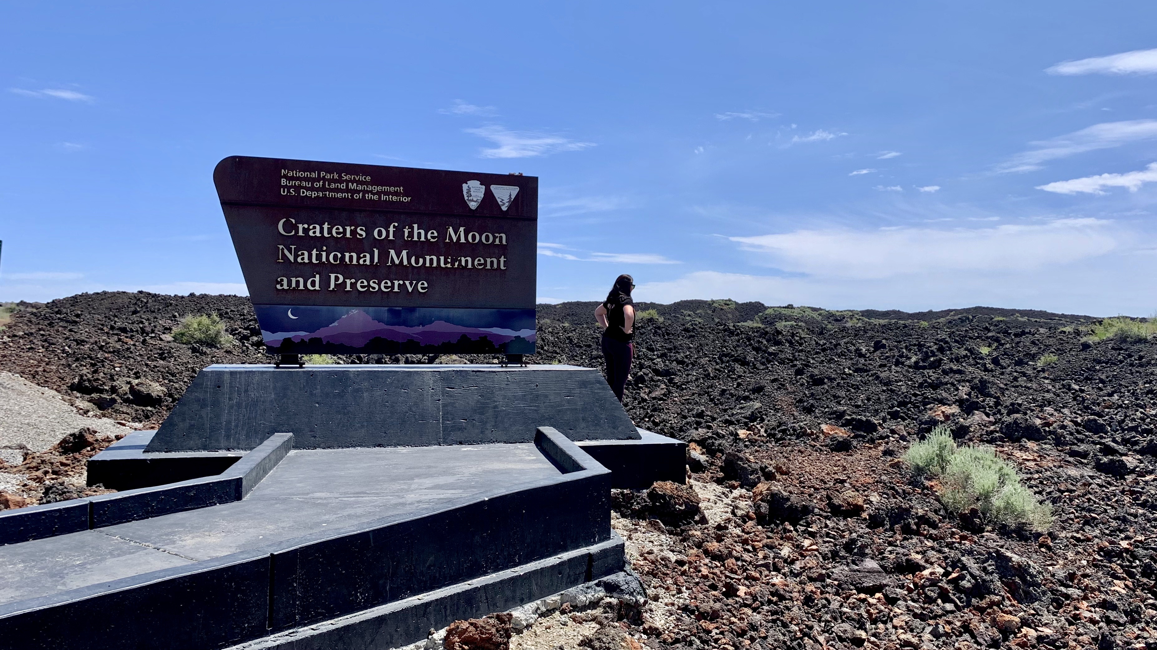 Kolem 13té hodiny přijíďíme do Craters of the Moon National Monument. Nejprve zajdeme do Visitors centra, zjistíme aktuální stav trailů (jeden z plánovaných je zavřený) a pak vjíždíme do parku. Parkem vede nádherný Loop Drive s různými odbočkami k jednotlivým trailům. Je tu velice málo lidí, alespoň ve srovnání s jinými parky. Ale je to určitě polohou parku, protože je prostě trošku z ruky. Kdyby tahle nádhera byla někde v Kalifornii, je tu hlava na hlavě.