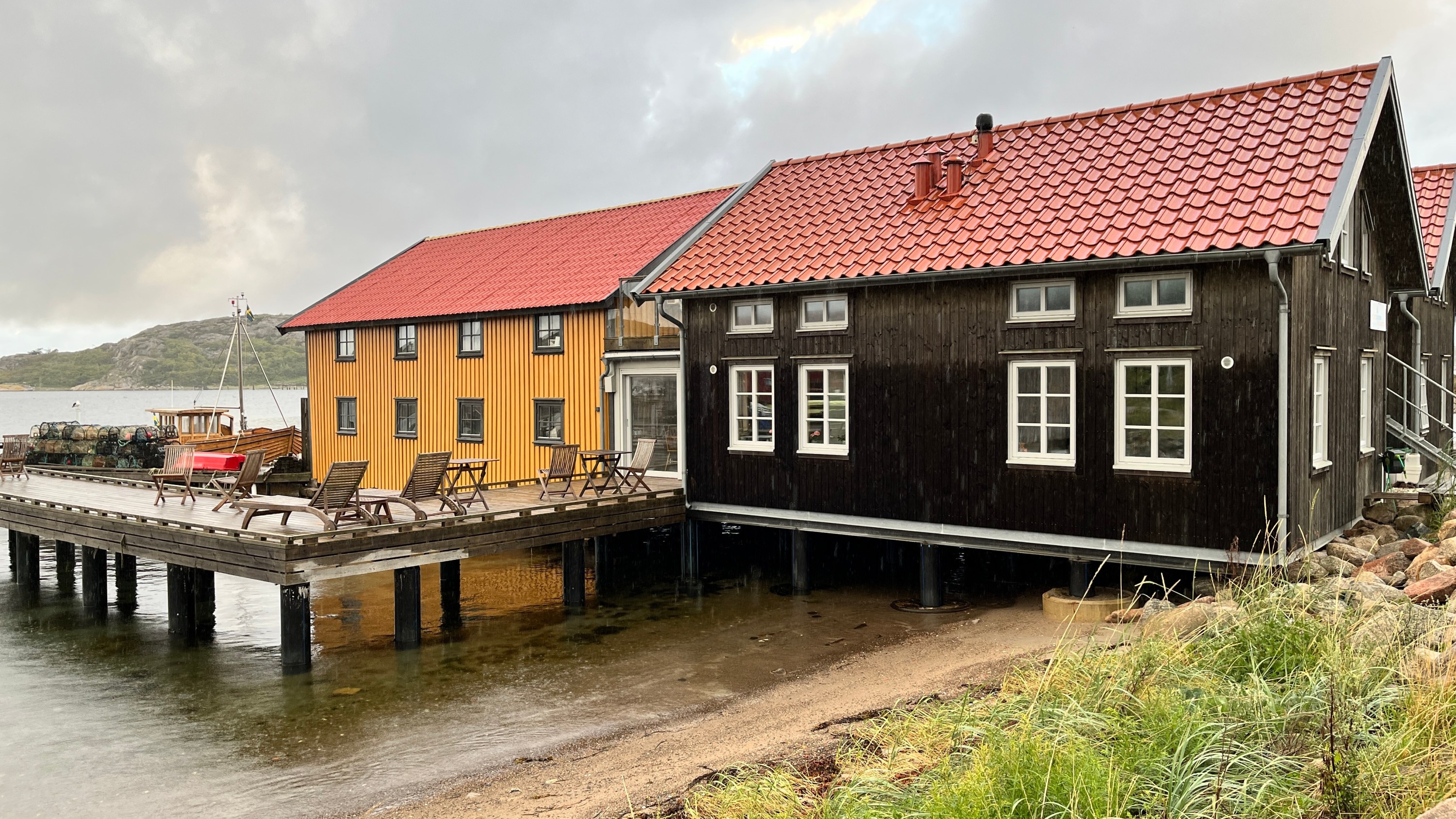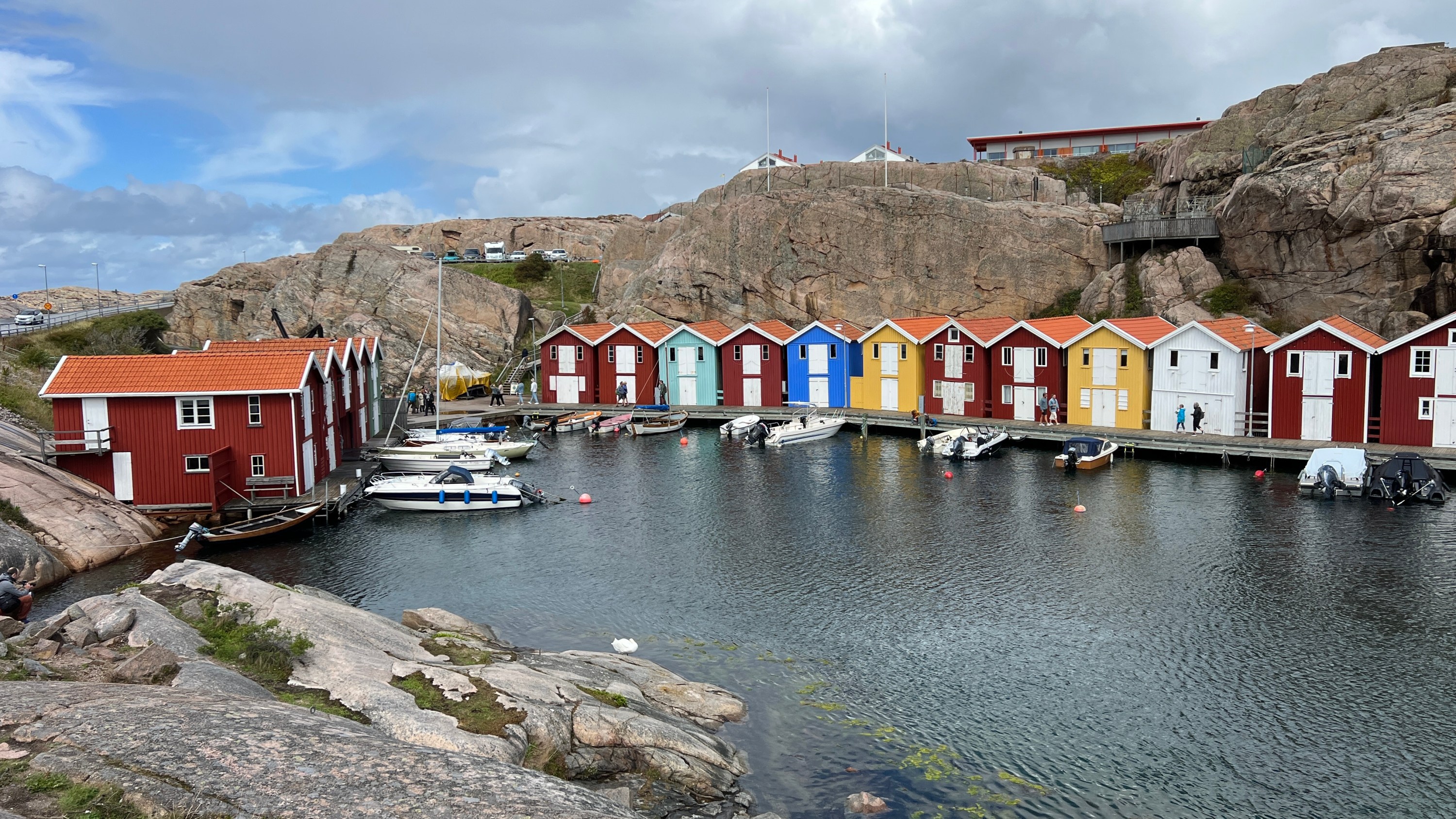 Vynechat nemůžeme ani známou vesničku Smögen. Je skoro na všech prospektech Švédska, je často fotografovaná a navštěvovaná. Protože je před bouřkou, lidí je tu maličko méně a dá se i něco vyfotit. Pak si dáme kolem 14té hodiny oběd a po návratu do auta začne vydatně pršet.