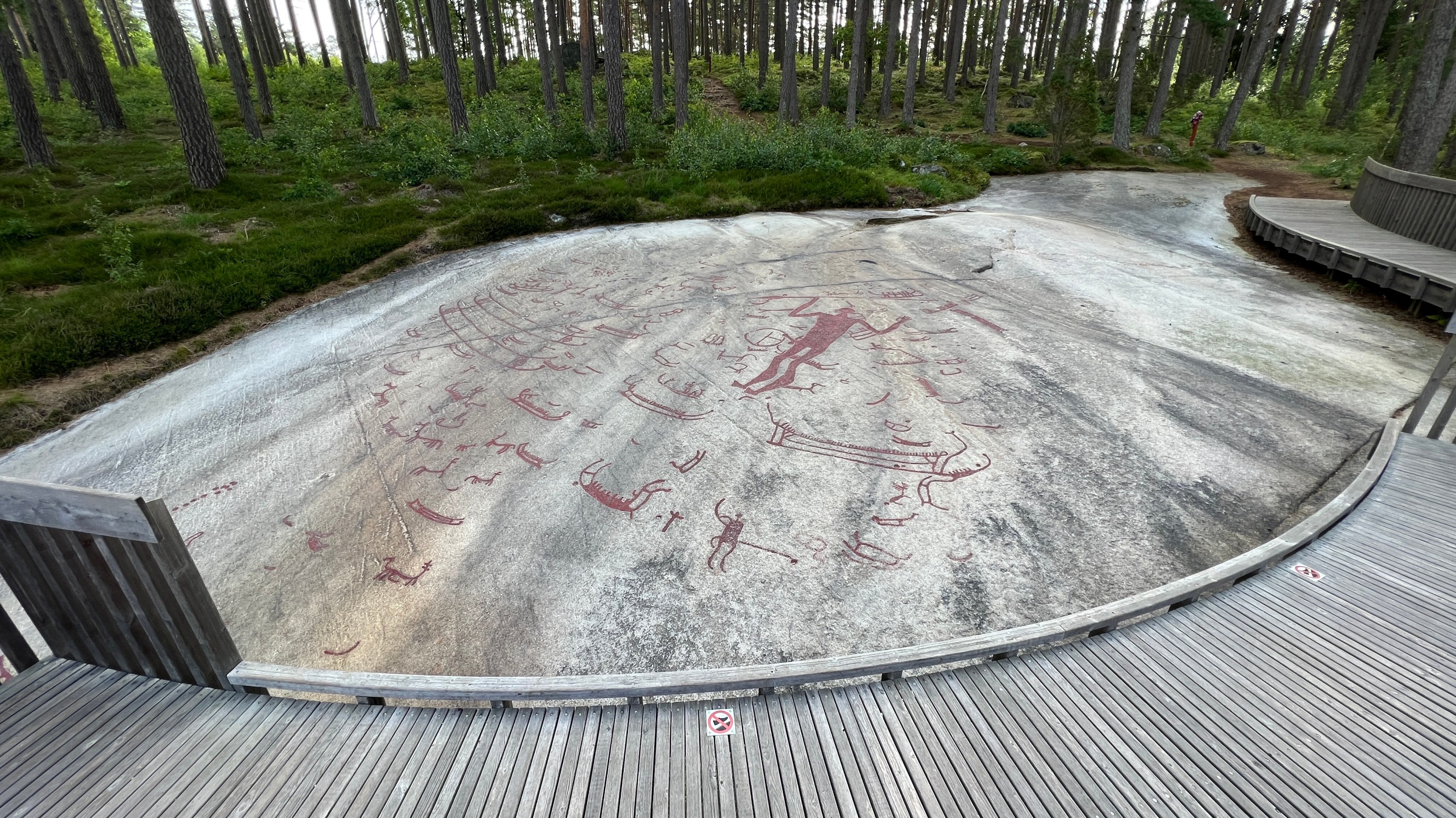 Když konečně v 9 vyrážíme, za chvilku nás čeká první zastávka: skalní rytiny v Tanum. Jsou vyryty do oněch oblých skalnatých výběžků, co jich tu mají plno. Pro zvýraznění a lepší viditelnost jsou obarveny červeně. Jsou tu už 4000 let.