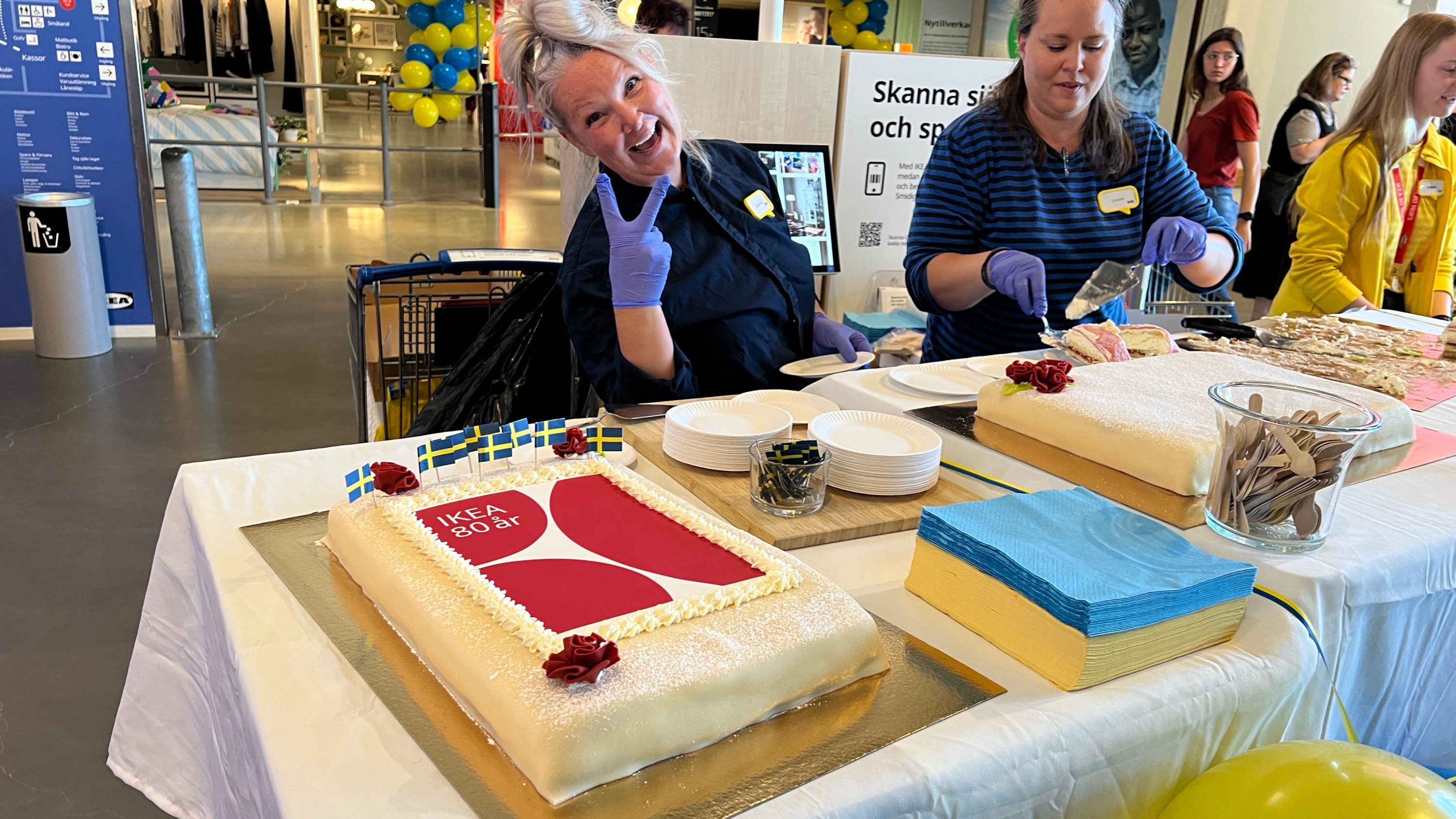 Oběd jsem dnes naplánoval „stylově“. Chtěl jsem vidět, jak vypadá švédská IKEA. Na místo jsme dorazili kolem 14:30 (zdržel nás Gustaf) a šli jsme hledat jídelnu. Malé překvapení nastalo, když se ukázalo, že to není jako u nás (tedy v Brně) a do restaurace se musí člověk prokousat přes celou prodejnu. A jak víme, to je veliký výlet. Jelikož jinou prodejnu než tu v Brně (a teď tu v Karlstadu) neznám, nemohu posoudit, jestli zkratka do jídelny je pouze Brněnská specialita, nebo je to tak i v jiných prodejnách. Jinak jídlo nezklamalo a bylo stejné co do sortimentu i chuti, jako doma. A protože zrovna oslavovali 80 let od založení, dole u vchodu nás čekal dortík ve žlutomodrém provedení.