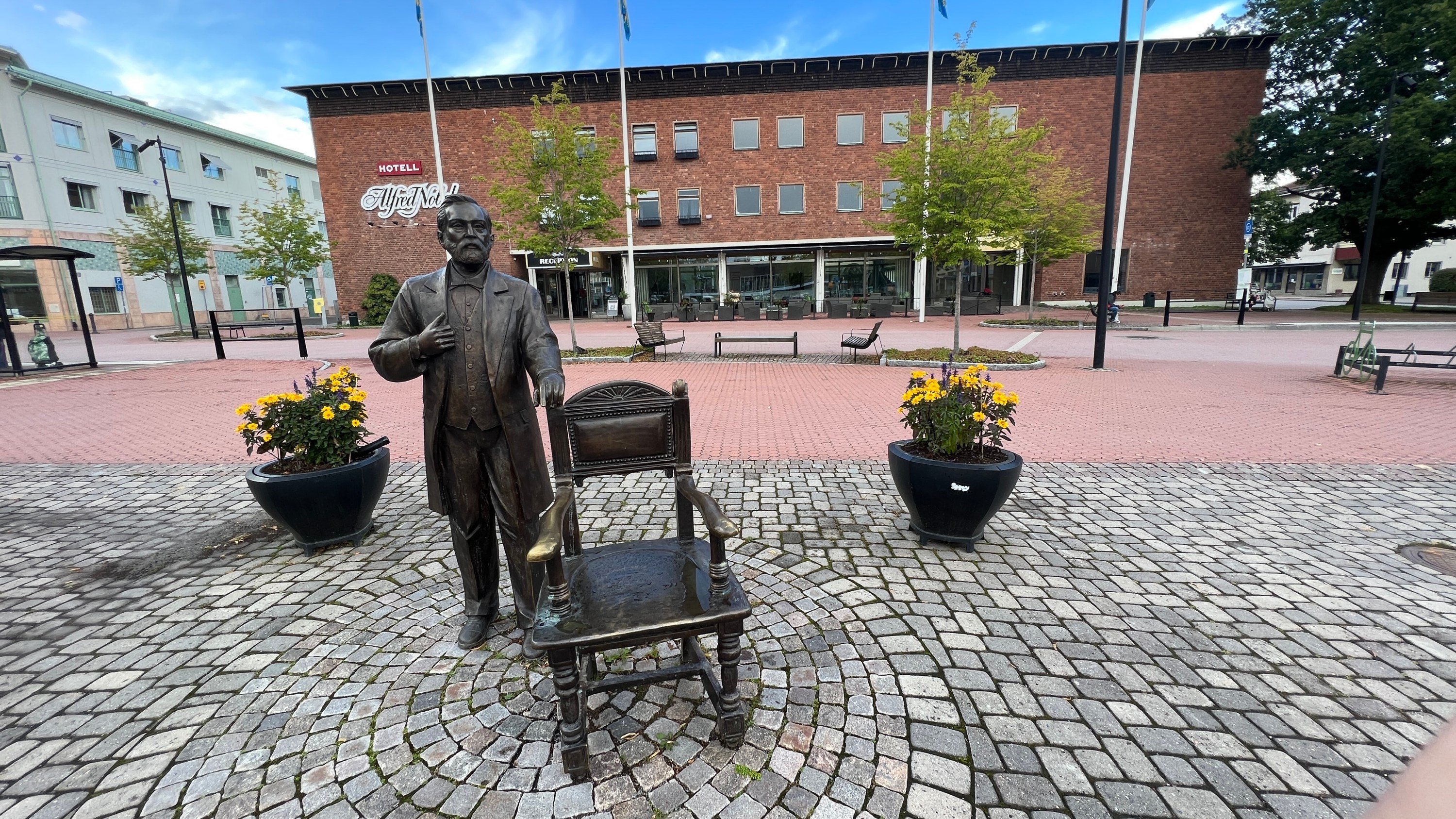 Pak ještě na skok do městečka Karlskoga. Tady dlouhá léta pracoval a žil Alfréd Nobel. Vše ve městě nese jeho jméno a na náměstí má svoji sochu.