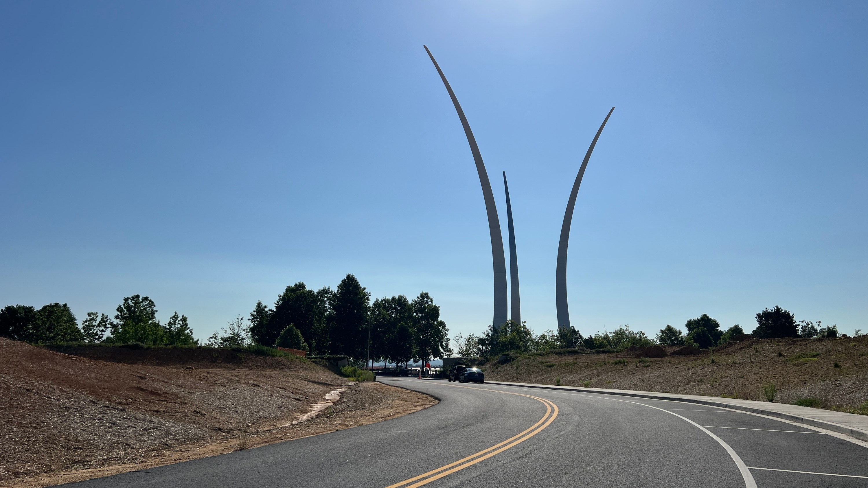 Tak, jako i jiné atrakce i muzea otevírají v 10 hodin. A je fajn tam být hned „ráno“, protože je tam málo lidí. A protože máme ještě dost času a jedeme okolo, zastavíme se na nakouknutí na Air Force Memorial. Památník je to impozantní a je odtud pěkný výhled na Pentagon.