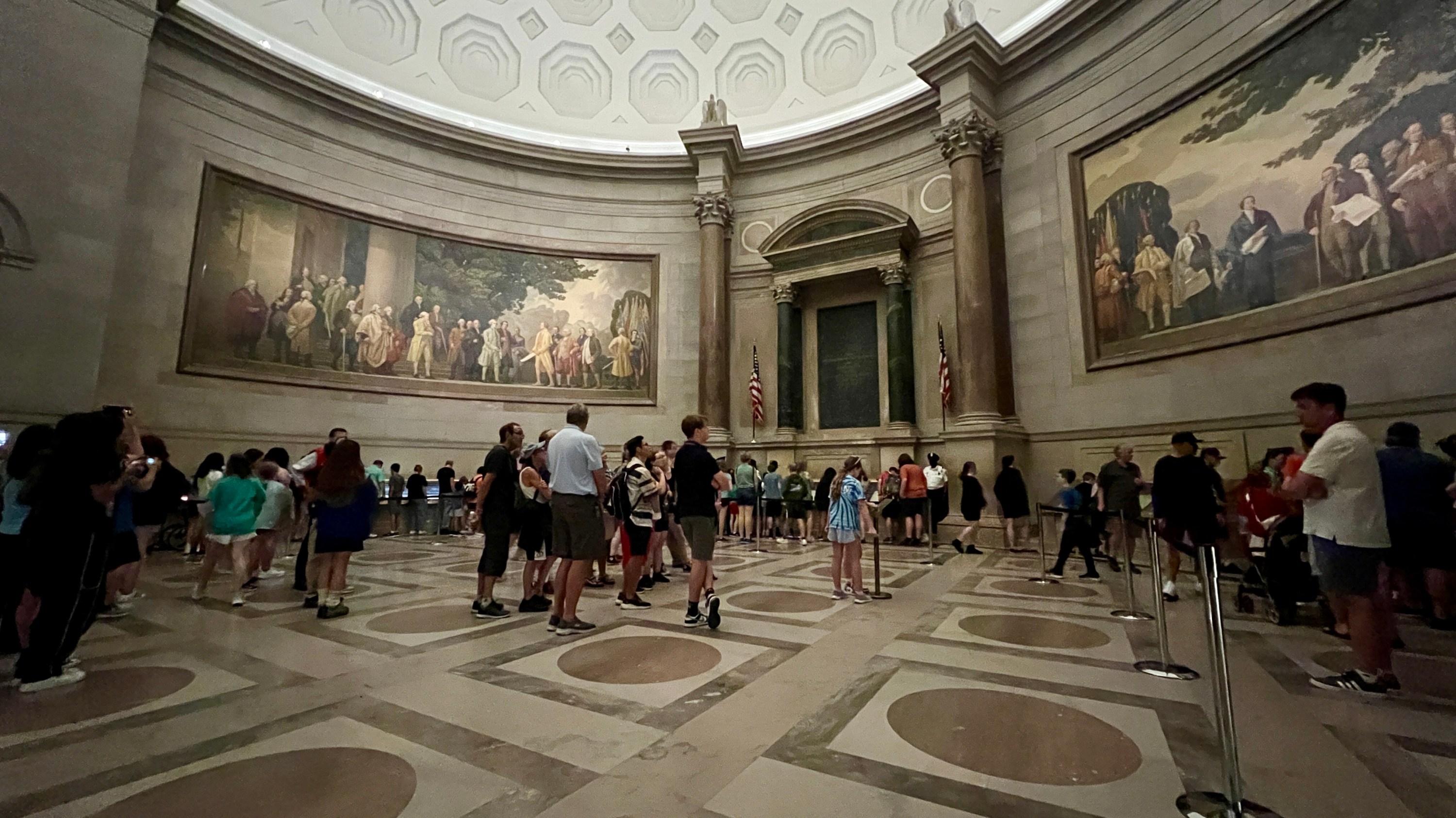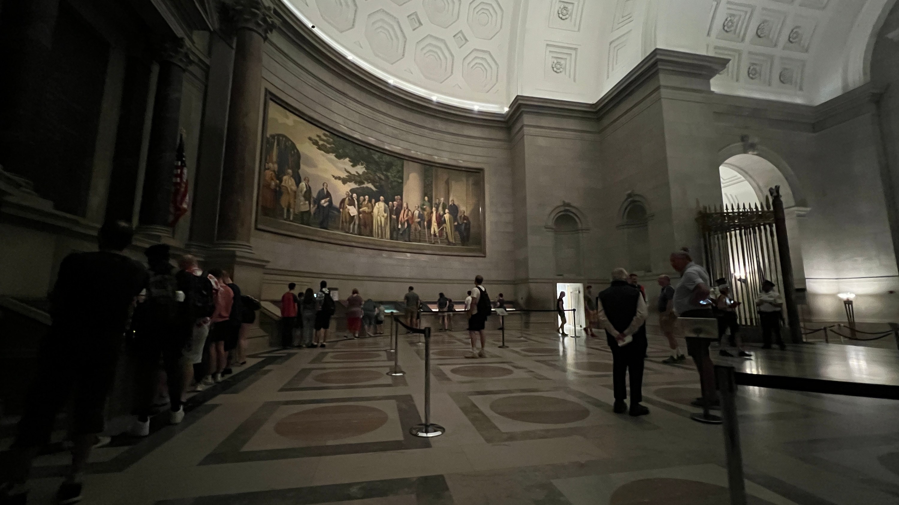 Hlavní atrakcí muzea / archivu jsou zakládací listiny USA. Po přísné bezpečnostní prohlídce jdeme do rotundy archivu, kde jsou za stálého dohledu vystaveny ony klenoty. Popravdě, moc toho vidět není. Celá rotunda je v přítmí a dokumenty (které se nesmí fotografovat) jsou ve spoře osvětlených vitrinách. Ale i tak se nám podařilo na ručně psaných dokumentech rozluštit pár jmen u podpisu na Deklaraci nezávislosti.